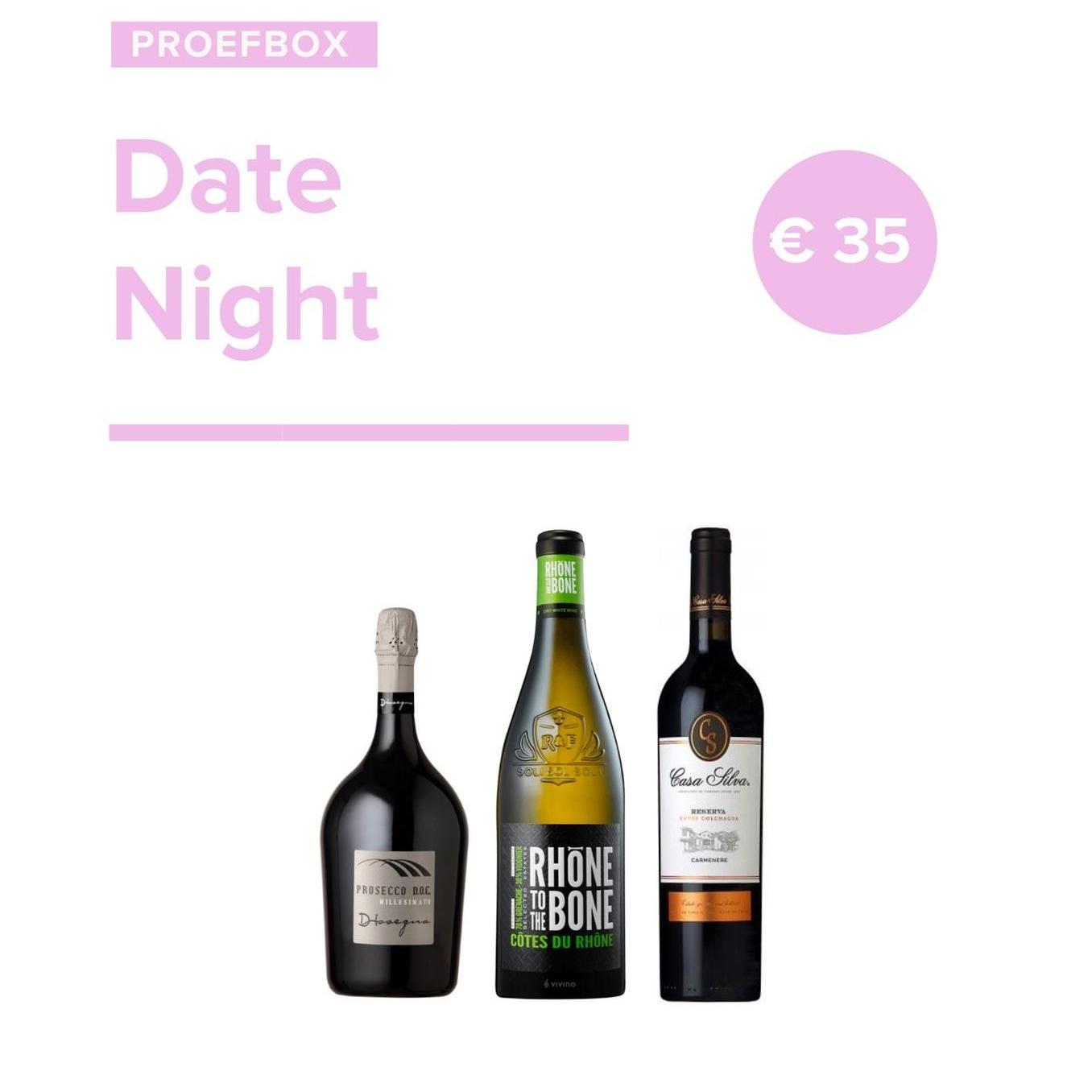 Kaarslicht, takeaway van jullie favoriete restaurant én onze proefbox. Het recept voor een cosy night in. Begin de avond met een glaasje prosecco, gevolgd door onze witte Rhône to the Bone en sluit af met onze Chileense topper van het wijnhuis Casa Silva. Quality time ten top!